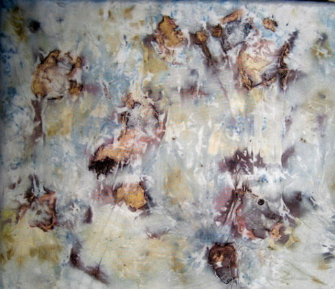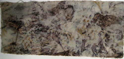 Bundle four : I decided to over-dye some previously rusted fabrics, eucalyptus leaves on stem, pomegranate skins around copper pipe: