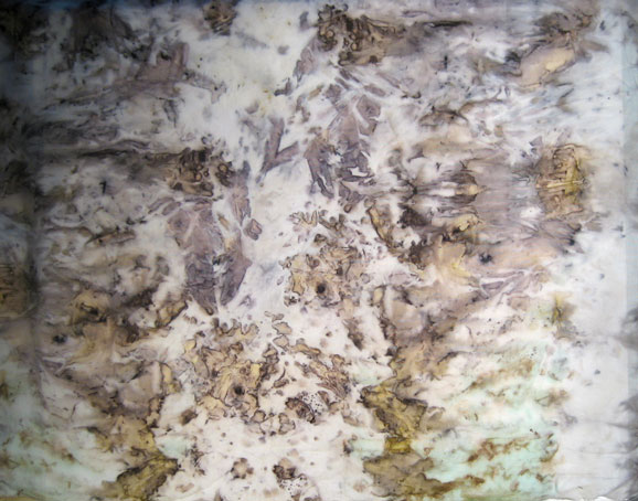 I have become more and more interested in trying out plant dyes, particularly as I have so many possibilities growing in the garden. There were a couple of old red cabbages that had bolted, so having researched the web and found references to making bundles (thanks especially to Wendy Feldberg), this is how I decided to proceed. All bundles were first soaked in a 20-25 % vinegar solution, then steamed for a couple of hours. turning the bundle over half way through. I unwrapped them the following day. I know some people leave them for much longer – I should experiment, but am impatient by nature!